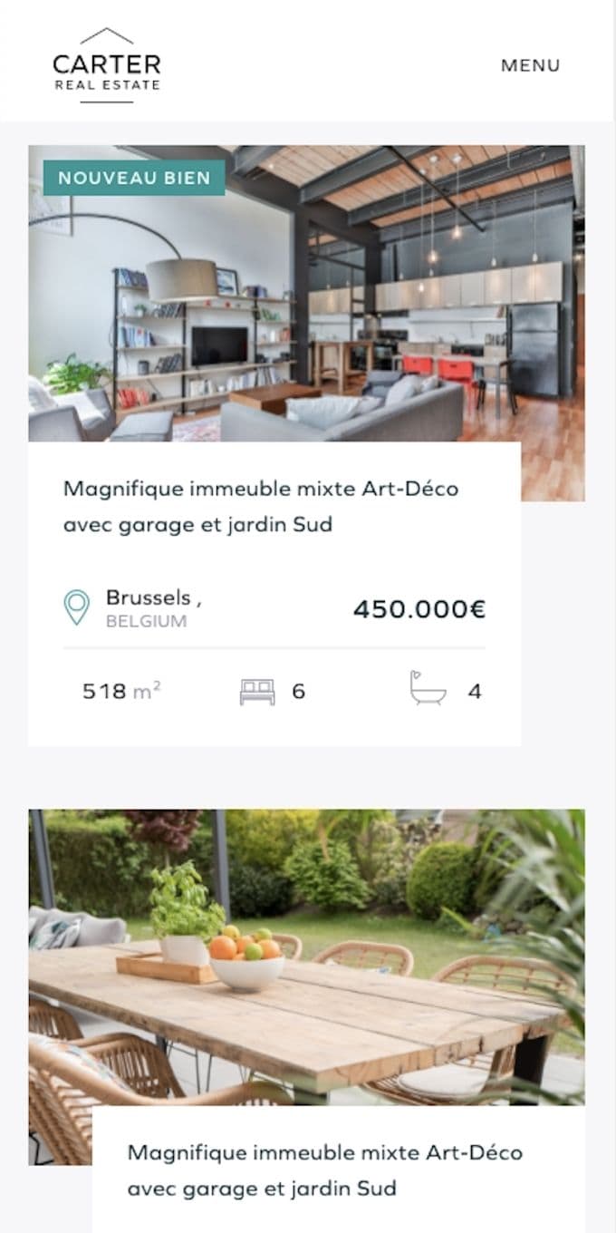 The website is one of the first sites we have made with a Jamstack approach. Indeed the content comes from an admin and the real estates come from their ERP. The serverless approach in this case allows incredible performance compared to excisting solutions on the market where the website makes a distant query at every display.